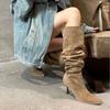 Сапоги Женские Сапоги с Толстыми Ногами и Тонким Каблуком, Сапоги до Колена со Сборками, Остроносые Сапоги с Мехом, Европейские и Американские Эластичные Сапоги, Высокий Каблук, Сапоги Средней Высоты