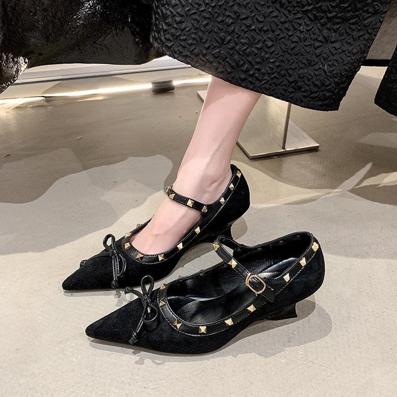 Заостренные замшевые туфли Мэри Джейн на высоком каблуке цвета Анкара красный с одной пряжкой 2025
