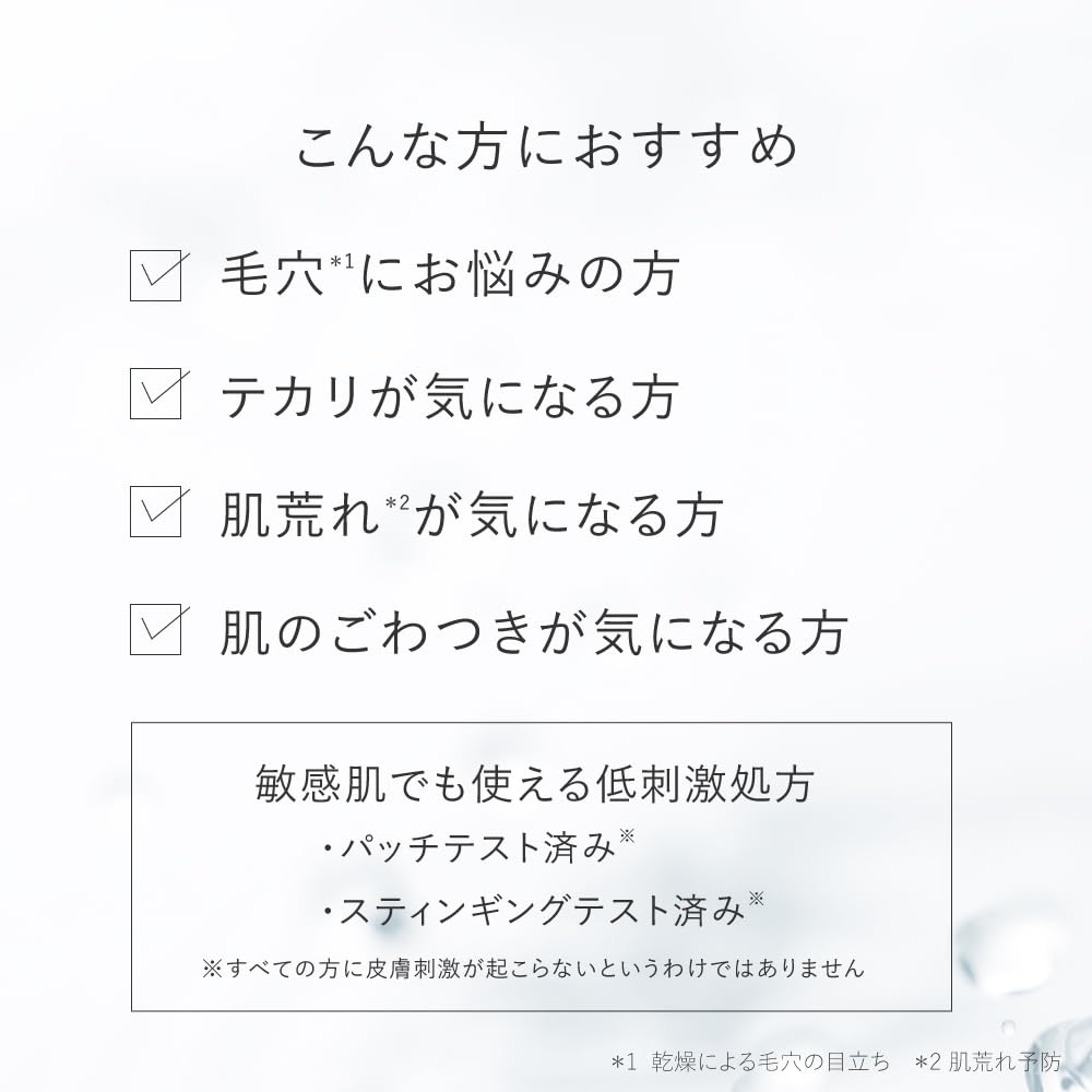 Этот специализированный пре-лосьон для ухода за порами содержит 6% глицилглицина*1, который воздействует на поры*2, оставляя кожу гладкой и без липкости.. Разглаживает шероховатость и жесткость на щеках и носу, поддерживая здоровье кожи. Он также содержит 2% концентрат производного азелаиновой кислоты*3 для борьбы с жирным блеском. Он также содержит экстракт листьев алоэ вера*1, который успокаивает кожу, подверженную воздействию УФ-лучей и сухости, а также щедрый запас тщательно отобранных косметических ингредиентов и семь ингредиентов, полученных из фруктов*4, оставляя кожу свежей и обновленной после очищения.. Он решает широкий спектр проблем кожи, которые все чаще встречаются у взрослых, оставляя кожу с чистой, увлажненной текстурой и предотвращая повторное возникновение проблем с кожей.. Не содержит глицерин. *1 Кондиционирование кожи *2 Видимые поры из-за сухости *3 Азелоил диглицинат К (кондиционирование кожи) *4 Сок лайма, апельсиновый сок, лимонный сок, экстракт боярышника, экстракт плодов ююбы, экстракт плодов грейпфрута, экстракт плодов яблока (кондиционирование кожи)