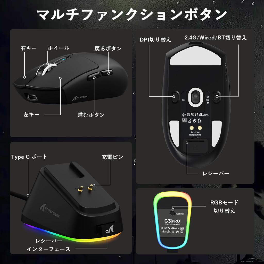 Беспроводная игровая мышь MAMBASNAKE x ATTACK SHARK G3PRO с магнитной зарядной док-станцией, RGB-подставкой для зарядки, беспроводной Bluetooth, проводная игровая мышь, 3