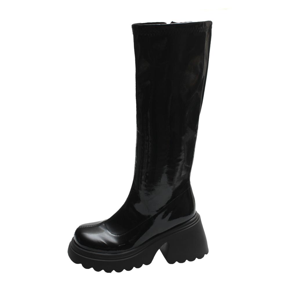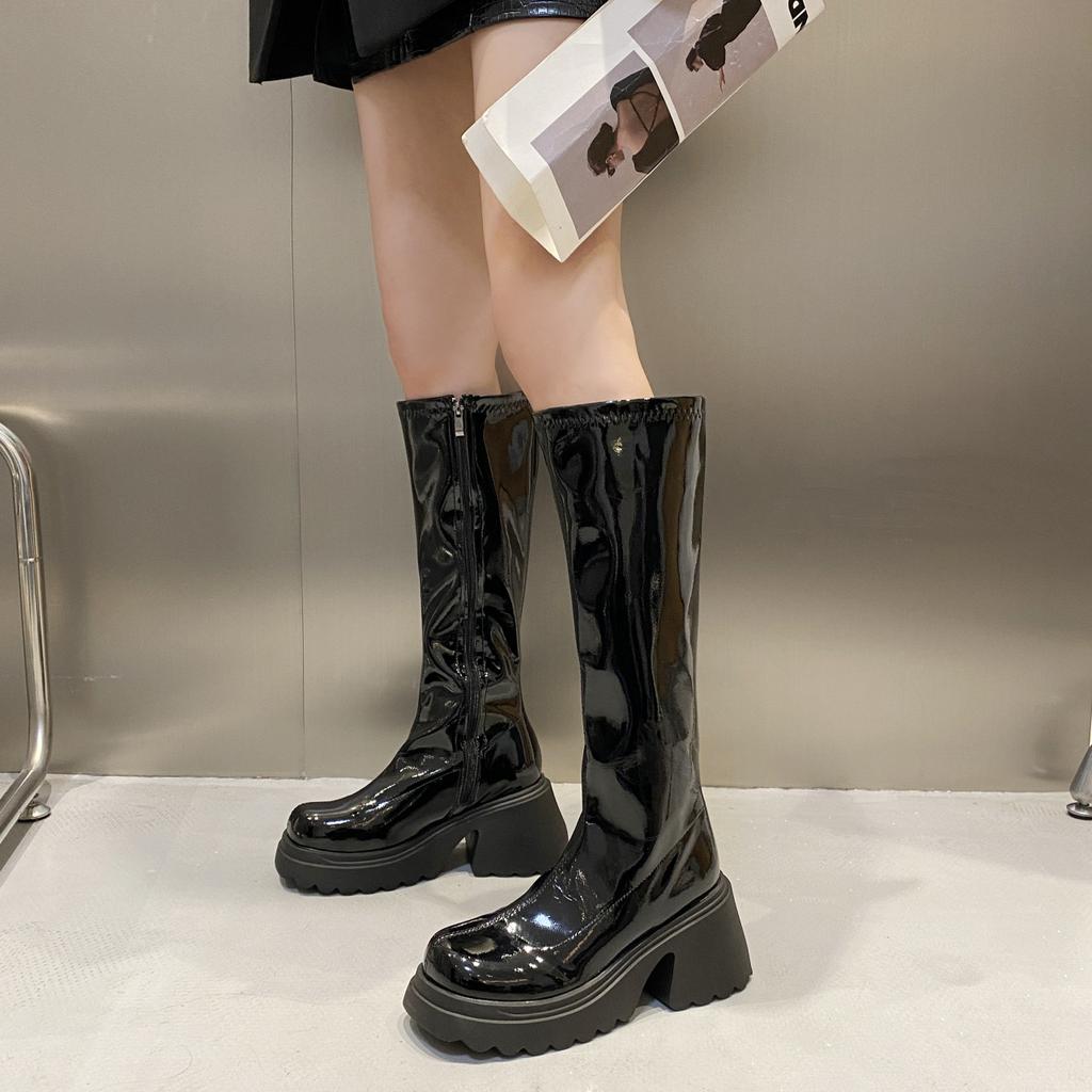 Черные ботинки женские осенние на толстой подошве эластичные ботинки водонепроницаемые настольные высокие ботинки лакированные ботинки на высоком каблуке толстый каблук тонкие ботинки