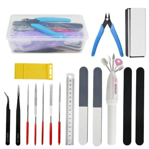 - Различные наборы инструментов: Содержимое пакета: 1 x кусачки с тонким лезвием, 2 x пинцета, 5 x напильников, 4 x двухсторонних полировальных бруска, 1 x полировальный брусок, 1 x стальная линейка, 1 x желтый разделитель деталей, 1 x электрическая шлифовальная машинка (Требуются 2 батарейки АА, которые вы должны приобрести самостоятельно, батарейки в комплект не входят), 5 шлифовальных головок.