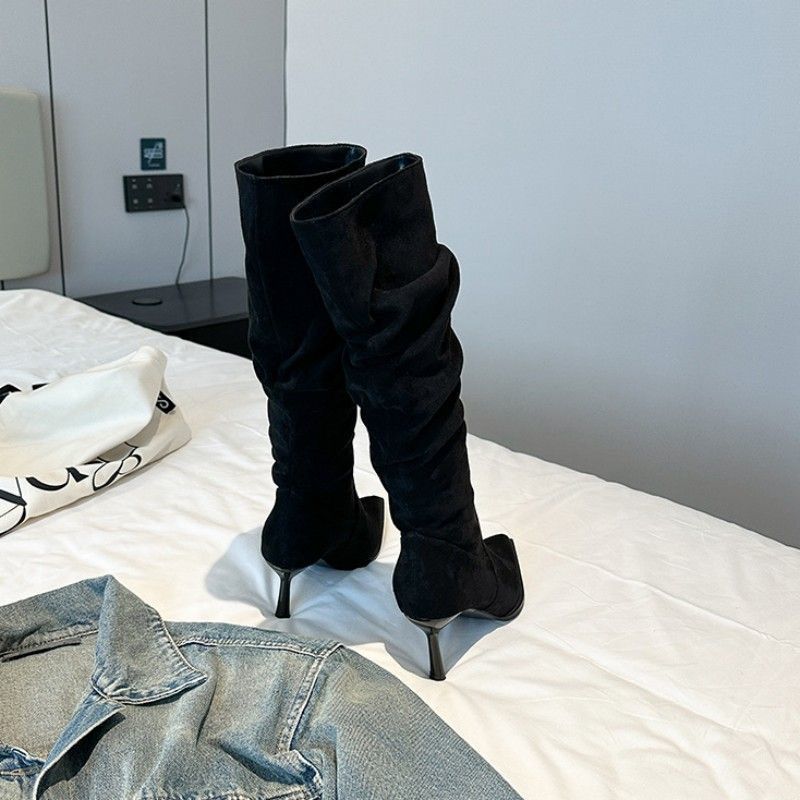 2025 осень и зима новая замшевая обувь с острым носком тонкий ковбойский стиль высокий каблук длинные рыцарские сапоги женские сапоги