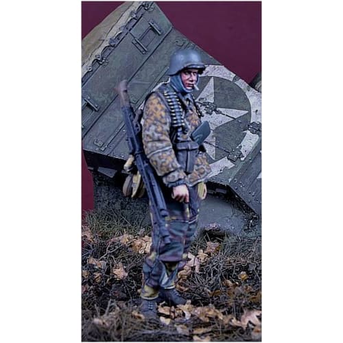 Представление продукта Миниатюра D-Day "1/35 Вторая мировая война Немецкая армия Ваффен-СС пулеметчик MG42 Группа Хансена Арденны 1944" смоляной набор. Это серия солдат из боевой группы Хансена, панцергренадерского подразделения немецких Ваффен-СС, участвовавших в Арденнской операции. (Битва за выступ) в 1944 году. Эта фигура изображает пулеметчика Ваффен-СС с пулеметом MG42, висящим на правом плече, и патронташами на обоих плечах. В правой руке у него пистолет, а на поясном ремне лопата. Штаны анорака для холодной погоды порваны на правом колене. Смоляной прототип/пример покраски: Павел Красицкий *Этот продукт представляет собой смоляной набор, требующий сборки и покраски.*Клей, инструменты, краска и т.д.. Для сборки и покраски требуются отдельные компоненты.*В комплект данного изделия не входят клей, краска, инструменты, батарейки и т. д. Предупреждение о безопасности: Не применимо