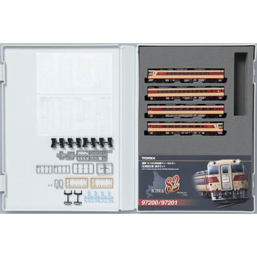 High grade (HG) specification.The Kiha 82-900 type, which appeared by modifying the Kilo 80 type, is reproduced with a new production.The Kiha 82-0 type reproduces the early model vehicle with one cooler added.The passenger door window reproduces the tablet protection grid characteristic of Hokkaido cars by printing.The jumper plug and hose on the front of the lead car are reproduced as separate parts.The Kiha 82-900 type belonging to Sapporo is equipped with cream colored through door gangplank.The green car, the Kilo 80 type, is different from the Kilo 80 type included in the 97200, as the conductor's cabin window remains in its original form, and it reproduces a vehicle with a radio antenna for Seikan ferry operation information.The Kiha has a blue color sheet, and the Kilo has a dark red color sheet.The head/tail lights and front display are equipped with a constantly lit board and an ON/OFF switch.The head/tail lights and front display are lit by bulb-colored LEDs.The front display uses a color prism and lights up in a color close to white.The train mark on the front display is replaceable and comes with printed parts ``Ozora (letters) and Okhotsk (letters)'', and ``Okhotsk'' comes with two types: thick letters and red letters.The car number is selectable and a transfer sheet is included.The door rails are printed in silver.Powered by a flywheel, new current collection system, and black wheels.Adopts M-13 motor and comes standard with TN coupler (SP).*The railway model is a system that supplies power from the rails.It does not use batteries even when running, emitting light, or lighting up.*This product does not include batteries.*This product does not use fuel.*This product does not include fuel.*This product does not include paint.
