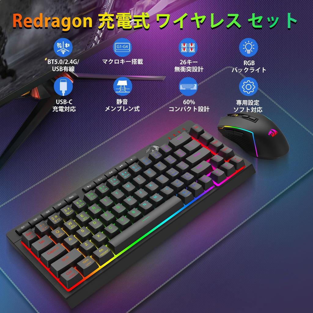Redragon Wireless Keyboard and Mouse Set, 60% English Layout, Quiet, 3-Mode Connection, BT2.4GUSB-C Wired, Rechargeable, Membrane, 16.8 Million RGB