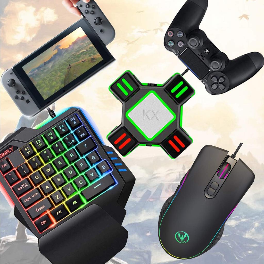 [Начинайте играть с этим цельным набором!] В этот набор входят RGB одноручная клавиатура, RGB мышь, специализированный конвертер и адаптер Type-C. Не нужно беспокоиться о проблемах совместимости с вашей любимой консолью. Избегайте тратить деньги на неподходящие преобразователи. Начните играть прямо сейчас! Совместим с Switch, Switch Lite, PS4, PS4 Slim, PS4 Pro, PS3, Xbox One, Xbox One S и Xbox One X. Идеально для FPS, TPS, RPG и RTS игр (несовместимо с такими играми, как APEX и Minecraft). Хотя он совместим с Fortnite на Switch, если вы столкнетесь с проблемами подключения из-за неправильного подключения, мы рекомендуем связаться с продавцом.. уведомление: Этот продукт не поддерживает наушники, голосовой чат или назначение клавиш. Спасибо за Ваше понимание.