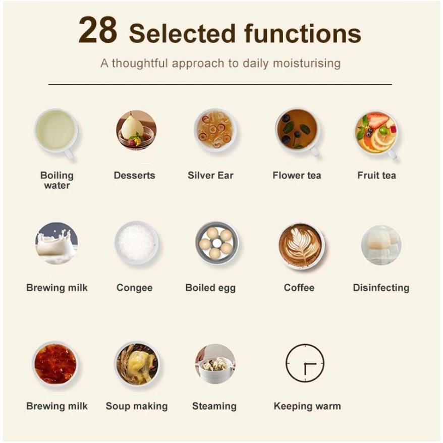 • Этот электрический чайник идеально подходит для приготовления цветочного чая, фруктового чая, супа, десерта, йогурта, тушеного птичьего гнезда, каши и многого другого. Его также можно использовать как подогреватель для молока и для приготовления детского питания.