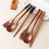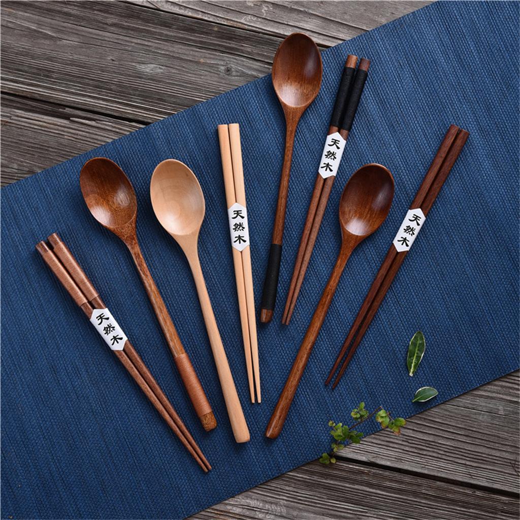 Набор, отличающийся портативным дизайном с гладкими, полированными поверхностями, включает палочки для еды и ложку, которые демонстрируют естественную текстуру дерева для эстетической привлекательности и удобного использования.