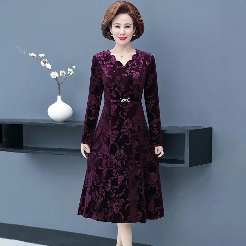Женское осеннее платье с v-образным вырезом и высоким давлением для женщин среднего и пожилого возраста, темпераментное длинное платье для мамы с длинными рукавами, женское элегантное платье