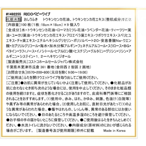 • Product Description RICO baby wipes - Unscented wet type baby wipes Contains highly moisturizing ingredients - Individually wrapped packs with lids that are easy to open and close Contents: 100 pieces x 9 pieces (900 sheets) Unscented, paraben-free, alcohol (ethanol)-free, baby wipes made from chlorine-free bleached pulp Contains ultra-pure water made in France and Aqua Cream, a moisturizing ingredient. Contains calendula flower oil and calendula flower extract, skin-conditioning ingredients that soften baby's skin. Individually wrapped packs with lids that are easy to open and close. *Seawater, hydrolyzed algin, phenethyl alcohol, sucrose. Sheet size (Wcm x Hcm) 18cm x 18cm Raw materials and ingredients Water, Calendula flower oil, Roman Calendula flower oil, Lavender flower oil, Tea tree leaf oil, Eucalyptus leaf oil, Calendula flower extract, Aloe vera leaf extract, Centella asiatica extract, Portulaca extract, Tea leaf extract, Ethylhexylglycerin, Polysorbate 20, Benzoic acid N a, citric acid, caprylyl glycol, seawater, hydrolyzed algin, phenethyl alcohol, sucrose, BG, betaine, raffinose, inositol, hyaluronic acid, histidine, glutamine, glycine, lysine, arginine, cysteine 1/2, hexanediol