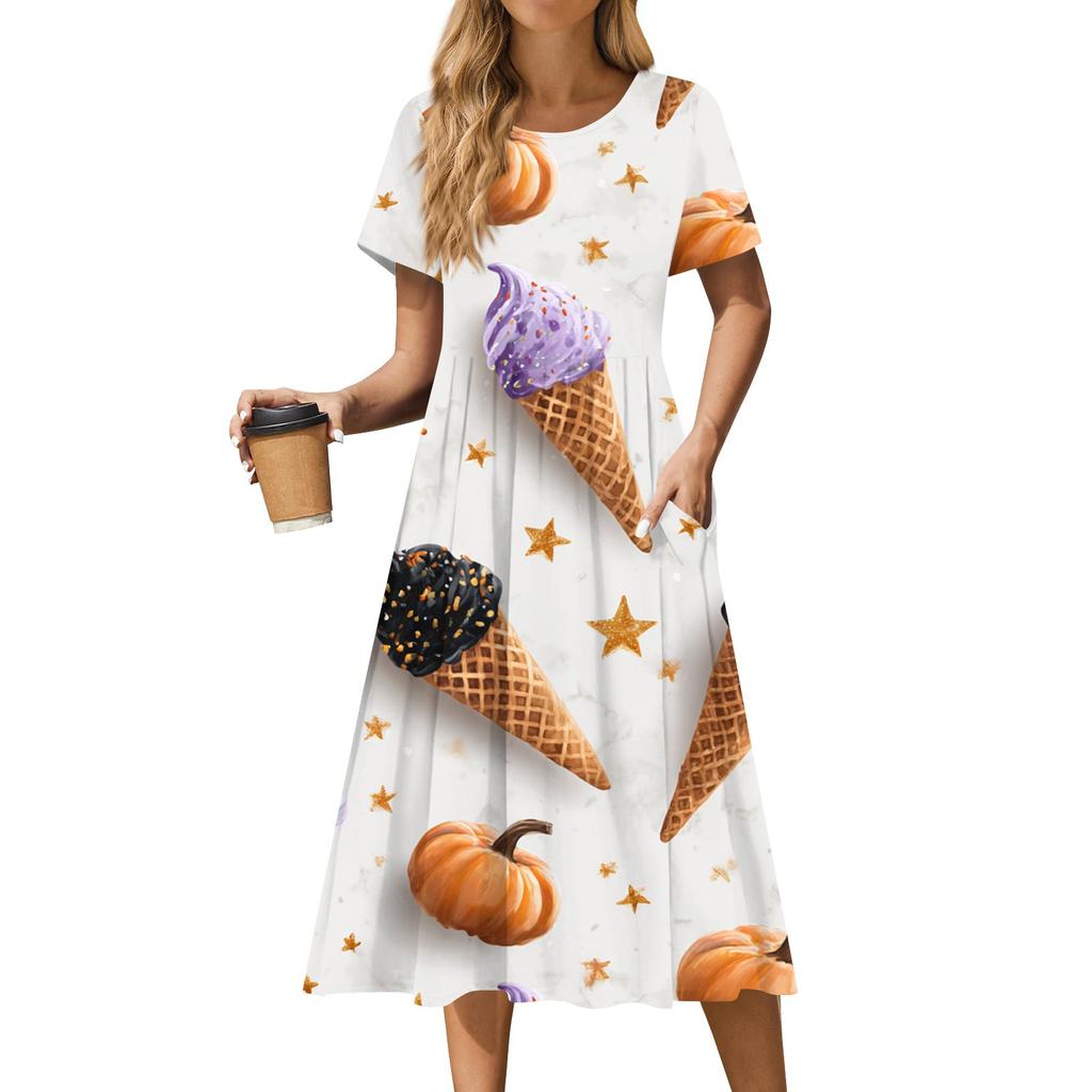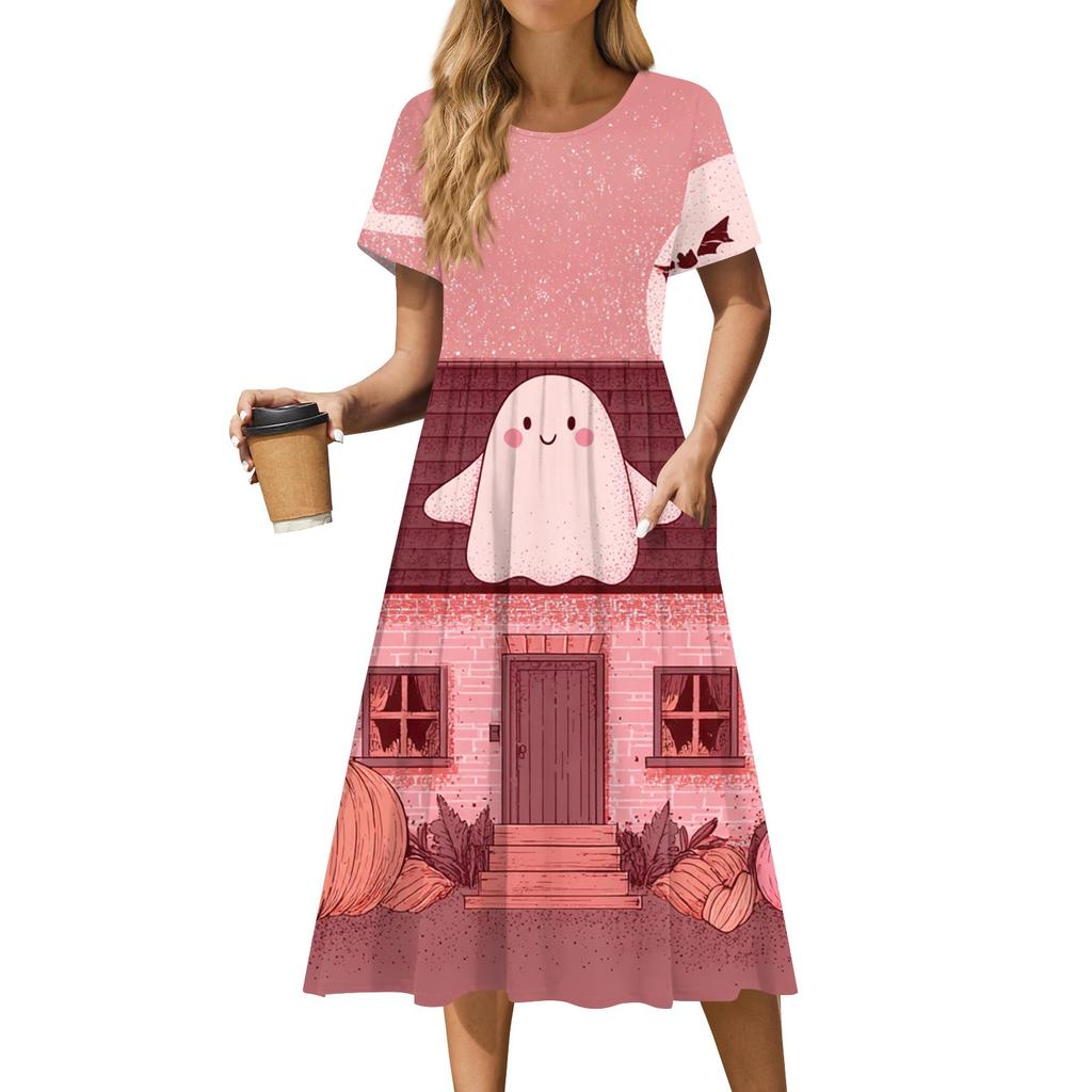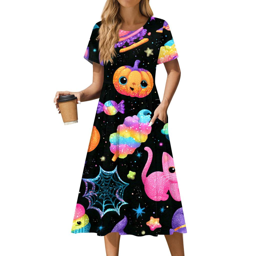 Женское повседневное модное платье с принтом на Хэллоуин, с коротким рукавом и круглым вырезом
