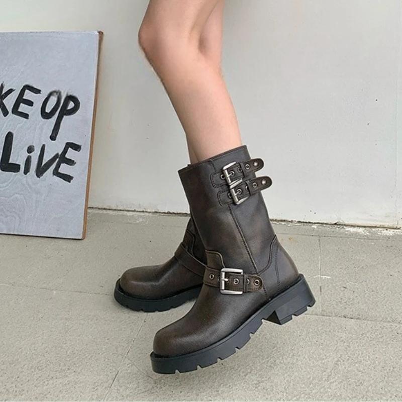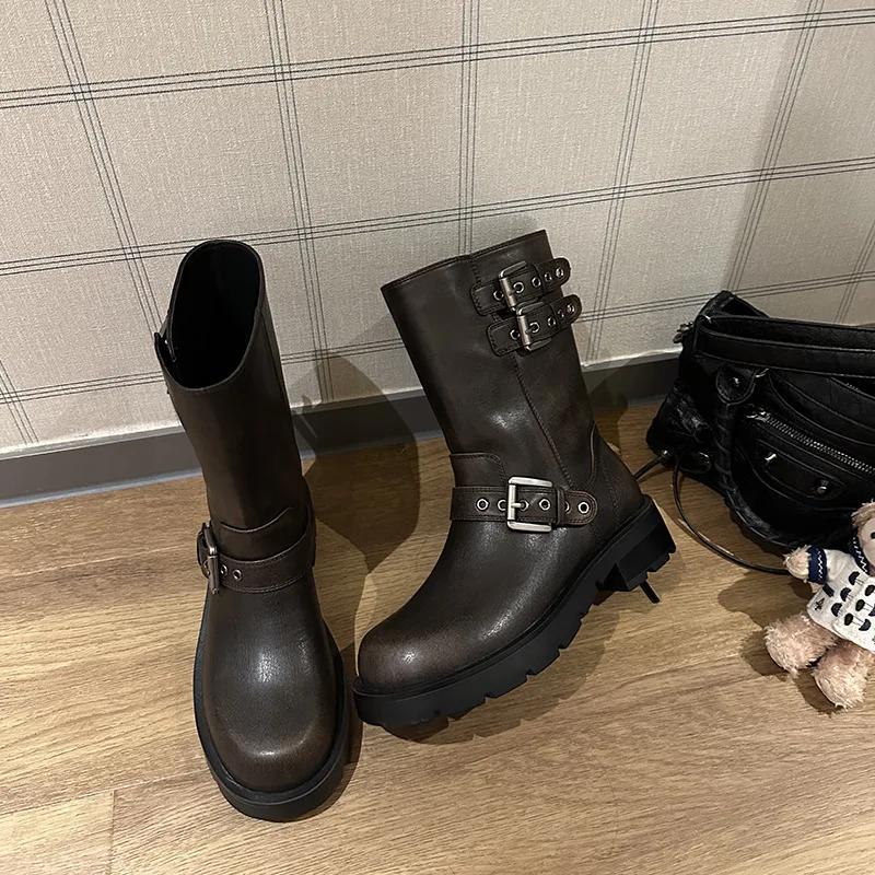 Весенне-осенние женские ботинки Ретро ботинки на платформе 2025 Круглый носок Однотонные Низкий каблук Короткая пряжка Повседневные женские модные ботинки