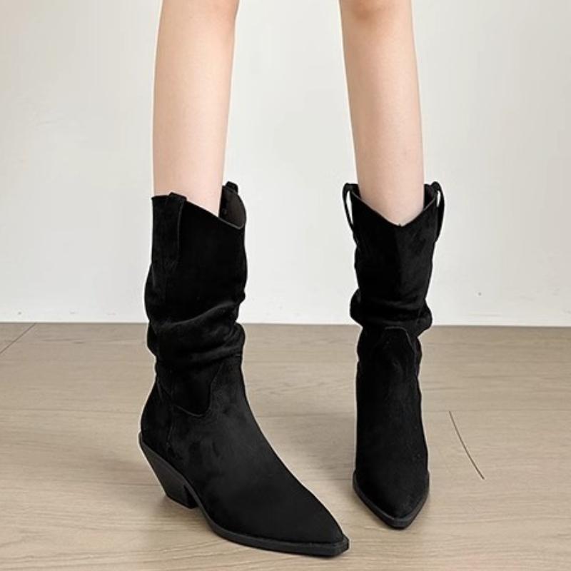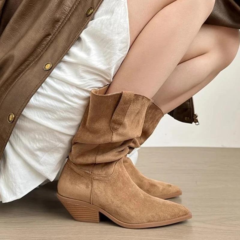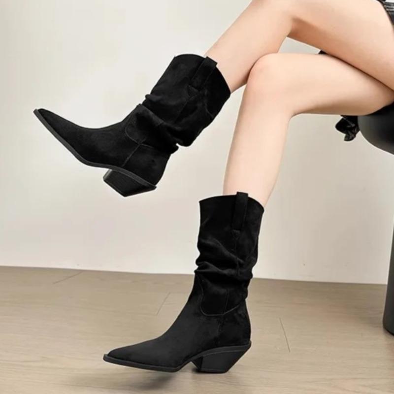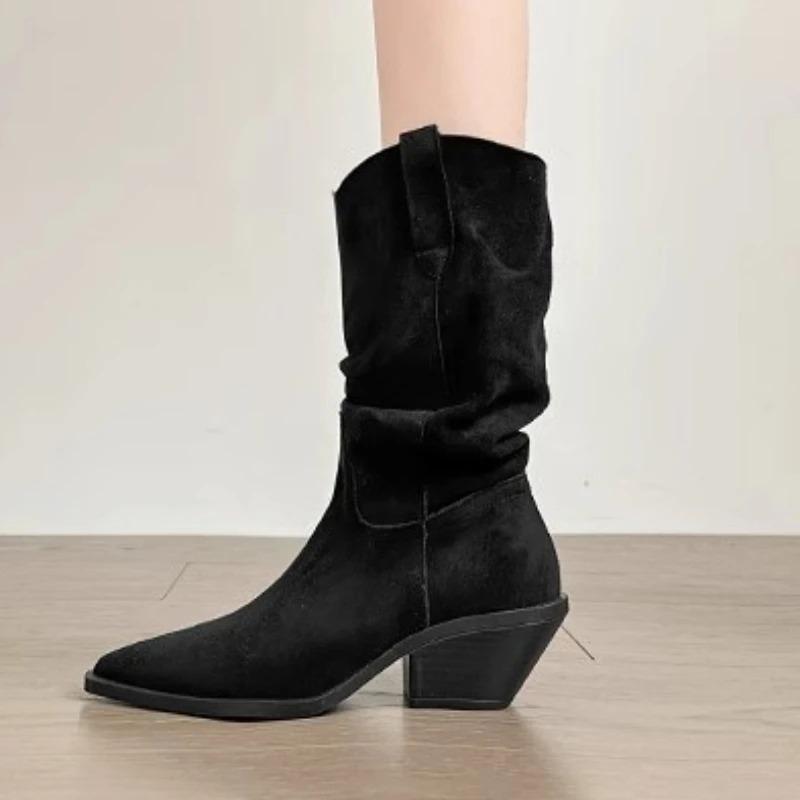 Женские ботинки Роскошные замшевые кожаные повседневные ботинки Модные ботинки до середины икры с острым носком Толстый каблук Ковбойские ботинки в западном стиле Botas Mujer
