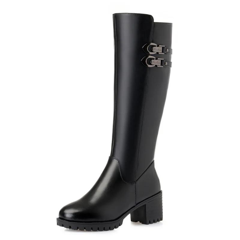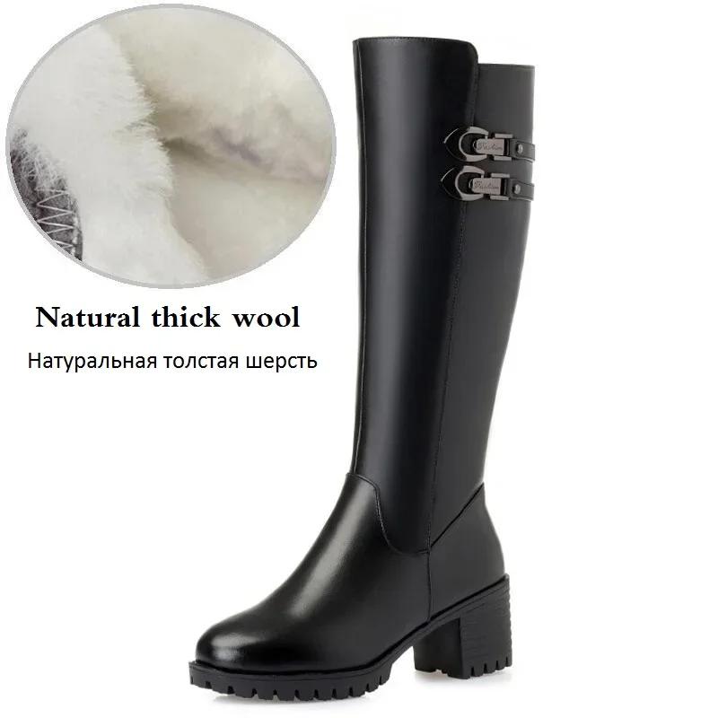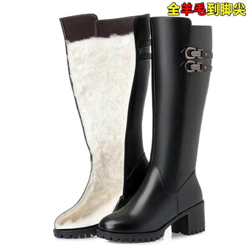 Зимние ботинки большого размера 35–43, женские шерстяные теплые сапоги до колена на толстом каблуке, женские сапоги на высоком каблуке с круглым носком из натуральной кожи