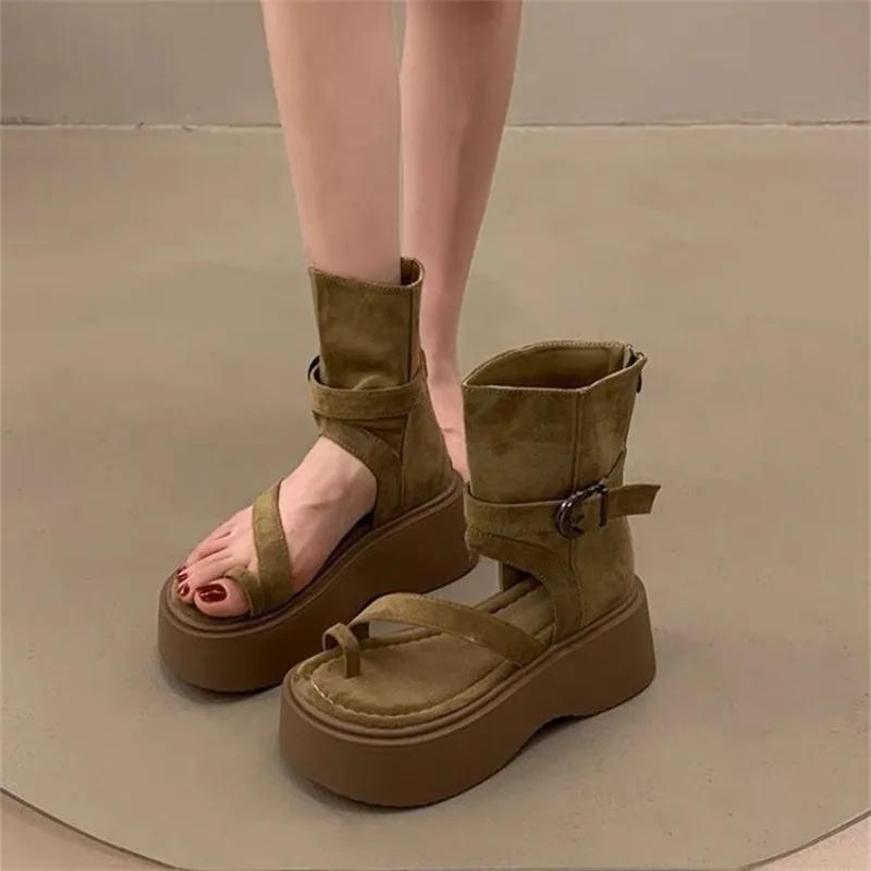 Ретро Ботинки на толстой подошве с высоким голенищем для женщин летом 2025 года, Новая модная верхняя одежда, Босоножки на высоком каблуке с открытым носком