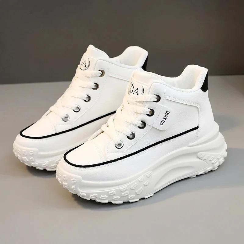 Женские кожаные высокие повседневные кроссовки, Женские 2025 Осень и Зима Новая Модная Дышащая Толстая Подошва Ретро Спортивная Обувь
