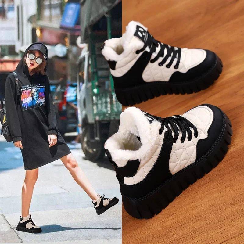 Женские хлопковые туфли 2025 Зима Новый стиль с плюшевой толстой подошвой Спортивная обувь, Противоскользящие и теплые Ботинки на шнуровке с высоким верхом