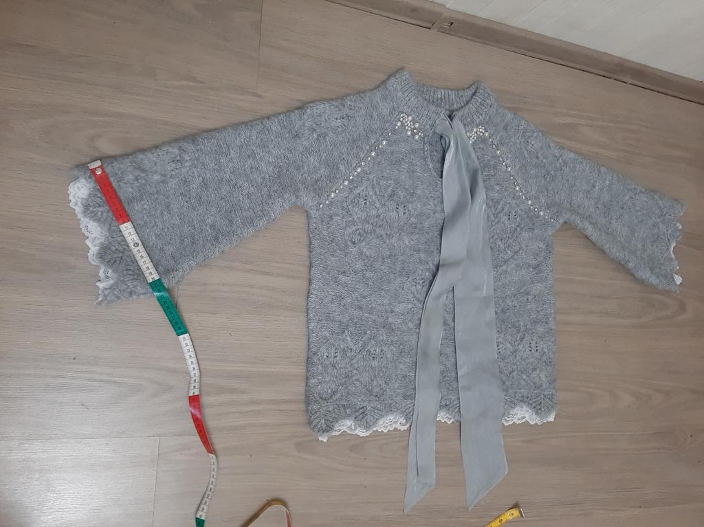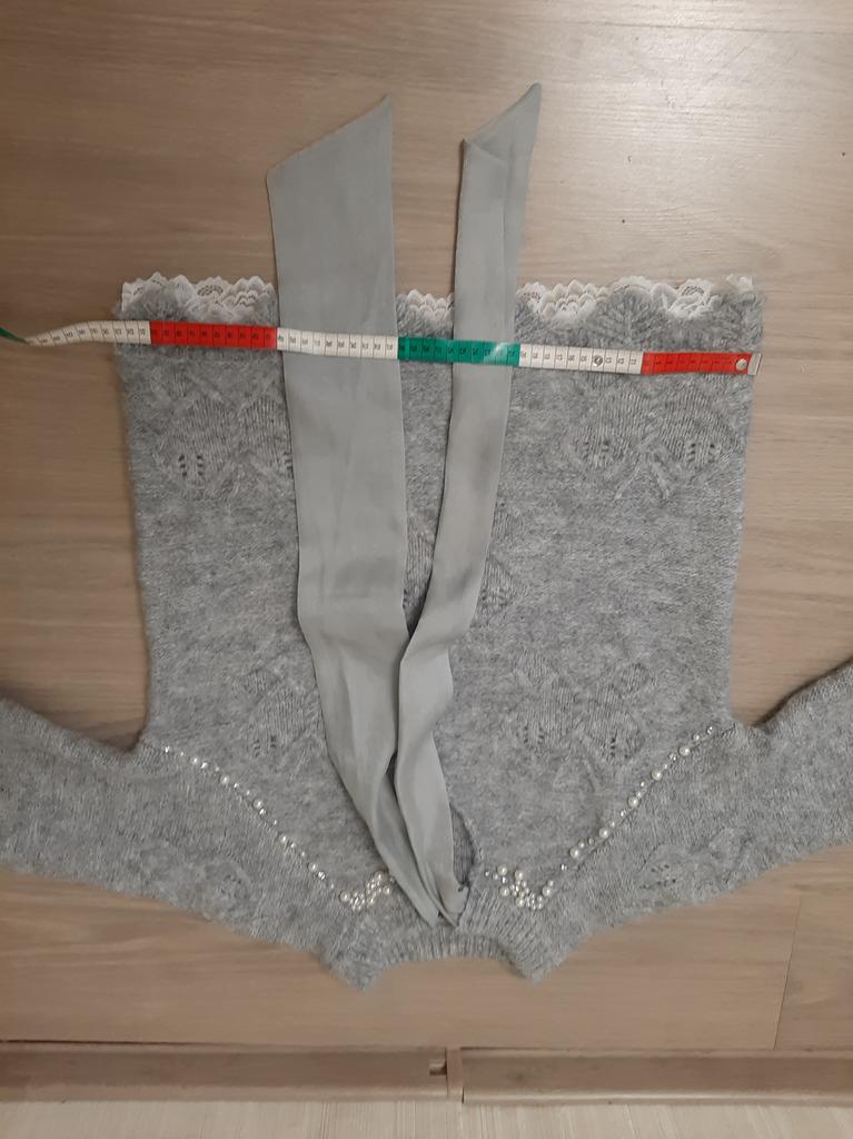 Свитер купила за 1870 рублей. Пришёл месяц назад. Впринципе очень тёплый. Я брала исключительно из-за ленты. Я думала, что она протянута через горловины, и я её буду менять на разные шарфы по имиджу. Оказалось, что ленты пришиты за край горловины. Кружева очень дешёвые, тонкие, мягкие. Швы на рукавах грубоваты, толстые. И свитер всё таки немного колется. Для меня он коротковат, да и рукава коротковаты. Мои параметры 110-100-110, рост 159 см.