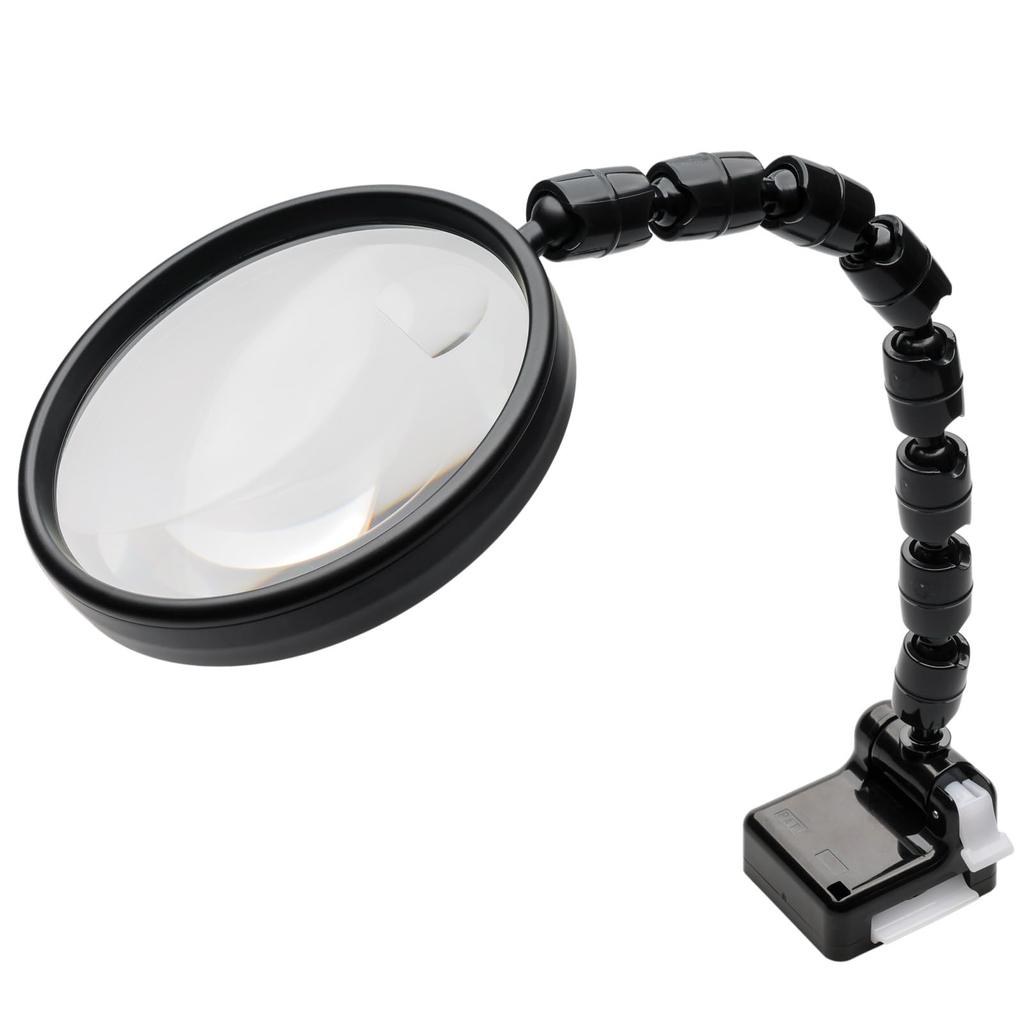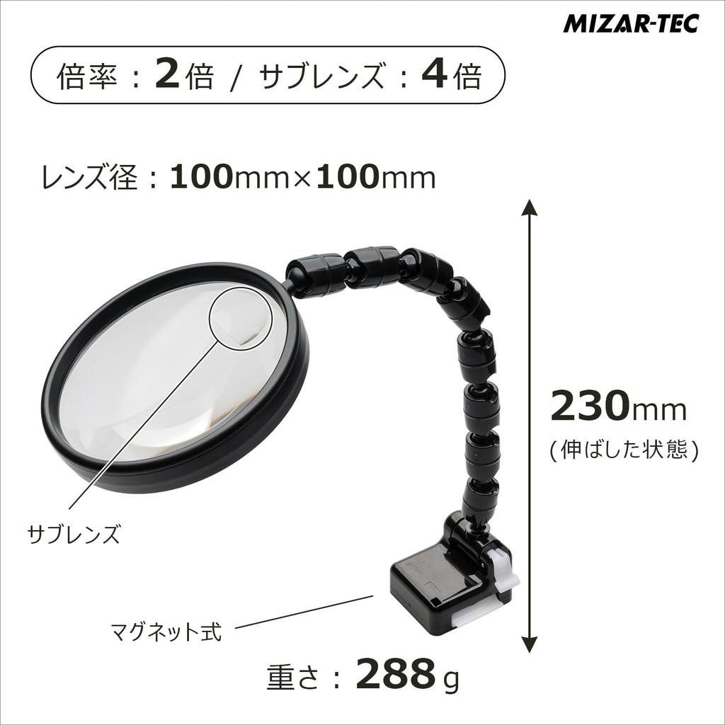 MIZAR-TEC KL-1720PM Magnifying Glass, Plastic Lens, 2x Magnification, 4x Small Lens, 100mm Lens Diameter, Flexible Gooseneck Magnifier with Magnetic