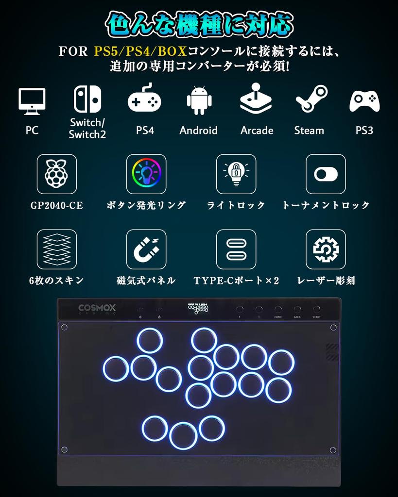 "Широкая совместимость" Совместим с Xbox One/Xbox Series X|S, ПК, Android, Steam Deck, PS4, Switch 2, Switch и Windows 10 или более поздней версии (в режиме клавиатуры). (*1 Отдельный преобразователь (Вингман XB) требуется для подключения к Xbox One/Xbox Series X|S. *2 Отдельный преобразователь (Бутер, и т.д.) требуется для подключения PS4/PS5. Для подробностей, пожалуйста, посетите официальный веб-сайт [cosmoxgaming.com/support/].)
