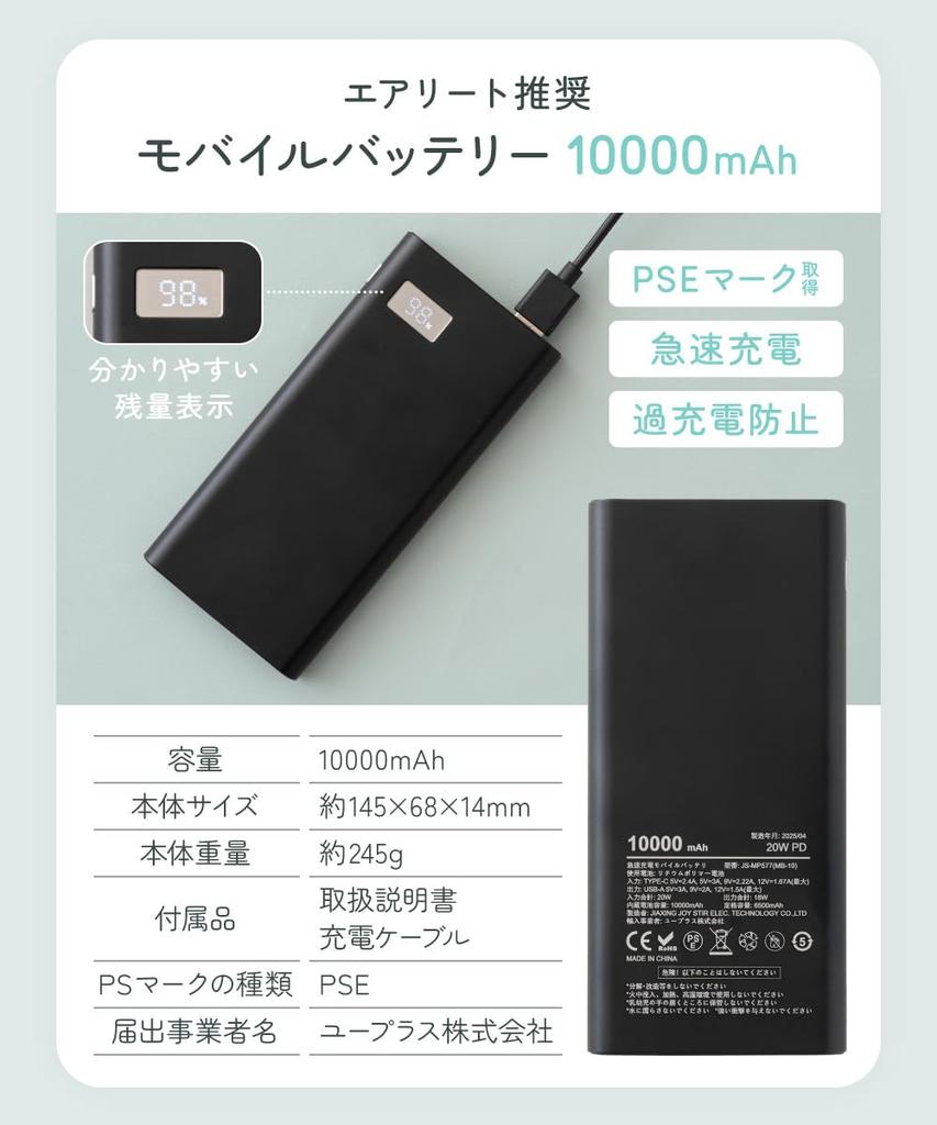 [Мобильный] Тип маркировки PS: PSE, Зарегистрированное название предприятия: Ю-Плюс Корпорейшн, Вместимость: 10000 мАч, Вход (Type-C): DC 5V/2.4A, 5V/3A, 9V/2A, 12V/1.67A (Максимум), Выход (Тип-A): DC 5В/3А, 9В/2А, 12В/1.5А (Максимум)