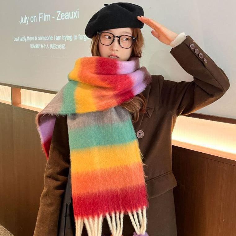 Dopamine Mohair Student Scarf Women's Autumn and Winter Trend Rainbow Striped Scarf Fur Ball To Keep Warm — купить товар онлайн с бесплатной доставкой по всему миру!