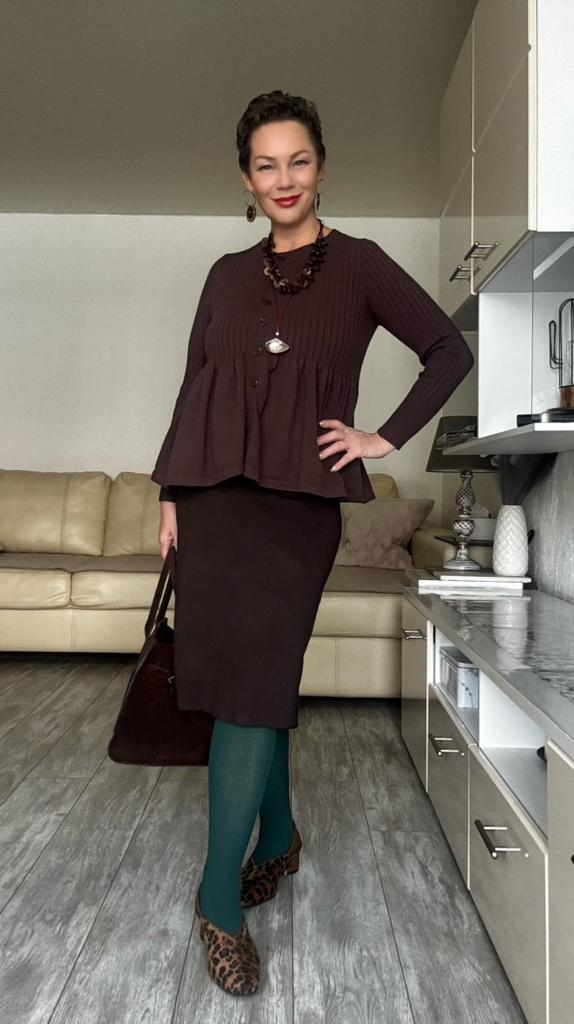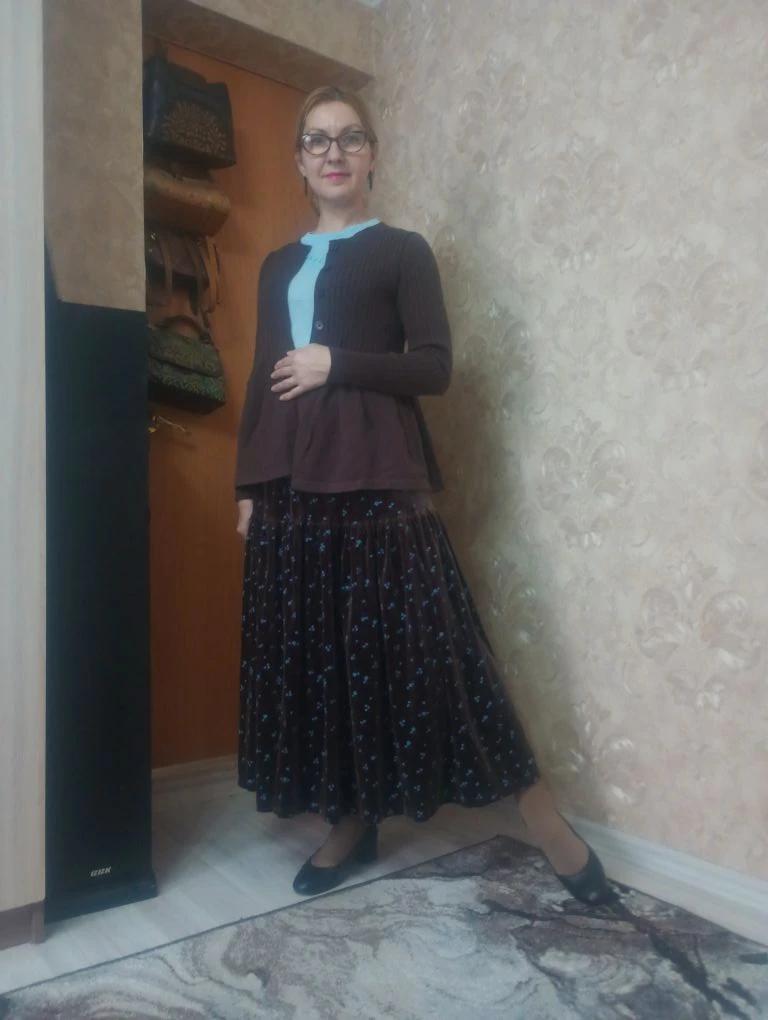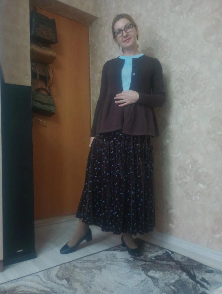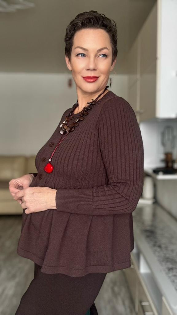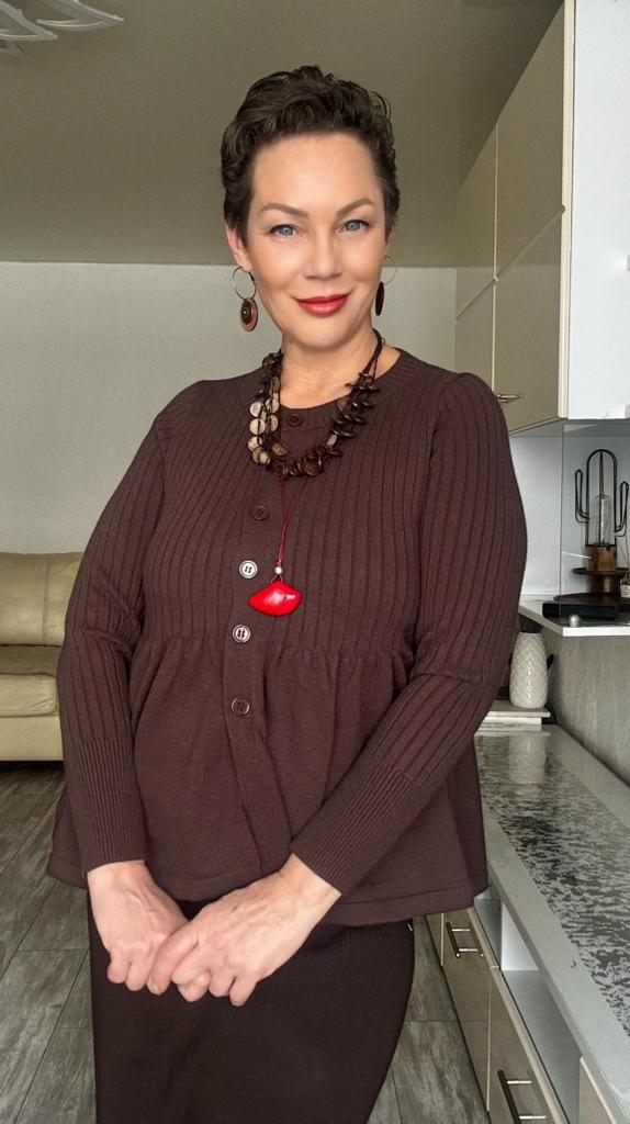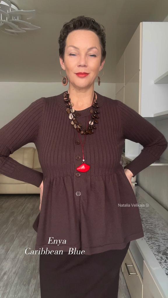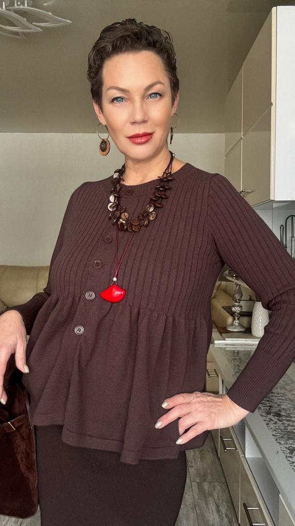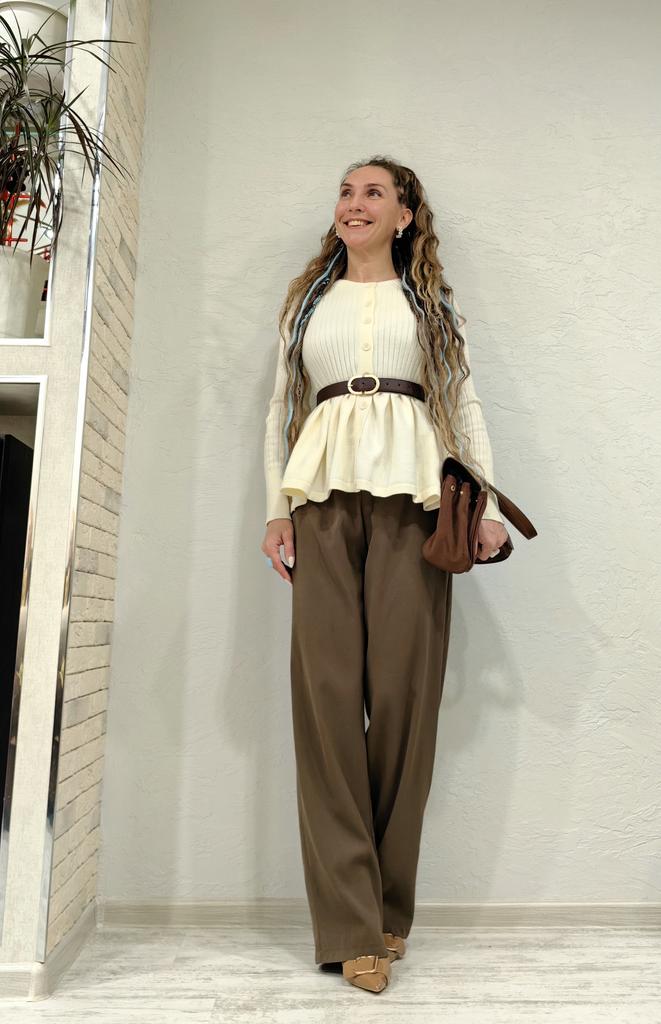Прелестная кофточка с баской🧡 Я опять выбрала шоколадный, цвет чудесный, калоритный, сочный)) Как она мне понравилась! Плотный качественный мягкий трикотаж, хорошо сидит по фигуре, не в натяг, смотрится очень благородно. Вот все совпало: качество, размер, фасон. Верх кофточки - трикотаж в рубчик, баска - гладкий трикотаж. Трикотаж комфортно поддтягивает фигуру. Карманов нет. Очень выразительно смотрится с поясом на талии. Можно носить с юбками-брюками)) На параметры 97-82-102 села идеально. Мой рост 158, подойдет и на девушек повыше. Замеры: Ог до 100см отлично! Плечи 35см, Рукав 61см, Длина 63см. Трикотаж умерено тянется) Достойная 💯❣️ От души рекомендую ♥️