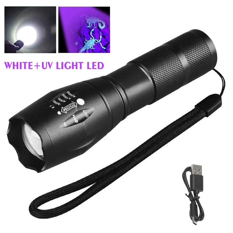 Перезаряжаемый УФ-фонарик Двойной свет 395 нм Ультрафиолетовый Белый фонарь Зум-фонари Осветительная лампа для обнаружения пятен от домашних животных Охота