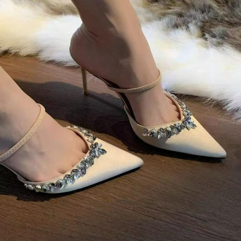 Элегантная женщина шелк блеск кристалл стразы острый носок неглубокие слинбэки летние сандалии каблуки туфли шлепанцы