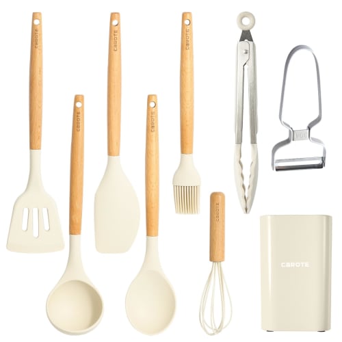 CAROTE 9-Piece Silicone Kitchen Utensil Set: Spatula, Ladle, Tongs, Whisk, Spatula, Brush, Shallow Spoon, Peeler, Tool Stand, High Heat Resistance, Be
