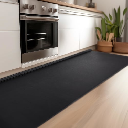 - Easy to clean This wipeable kitchen mat is made of water-resistant PVC (polyvinyl chloride) material, and has excellent moisture resistance and quick drying properties.When water, seasonings, or oil spills, or when small items cut while cooking get dirty, you can simply wipe them with a towel, stress-free.Since you don't need to wash it, you can easily remove dust by vacuuming it, reducing your housework time and saving on water and electricity bills.