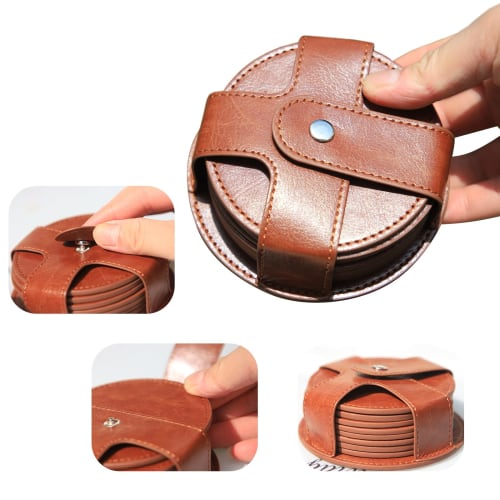 TOSSOW Coasters, PU Round Cup Mats with Storage Case, Waterproof and Heat-Resistant Pads, Set of 8 (Brown)