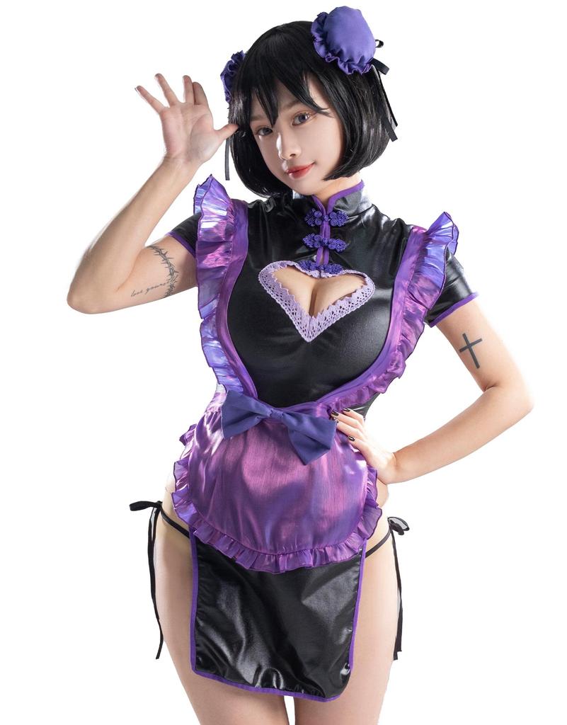 [Miccostumes] Взрослый женский костюм горничной, косплей-наряд, сексуальное платье в китайском стиле с низким вырезом в форме сердца, комплект нижнего белья (L, Черный и Фиолетовый)