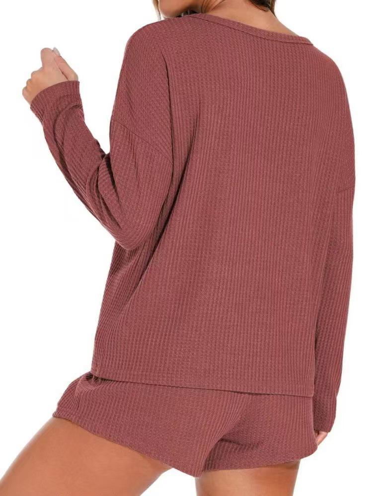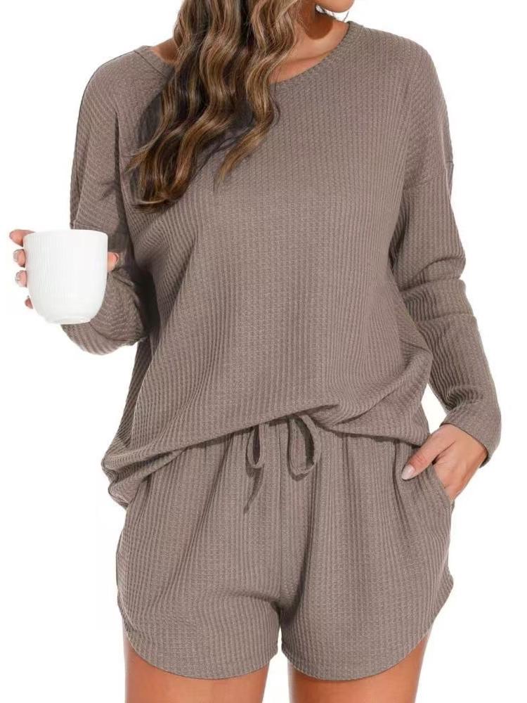 Женская европейская и американская однотонная домашняя одежда: Длинный рукав, круглый вырез, кулиска