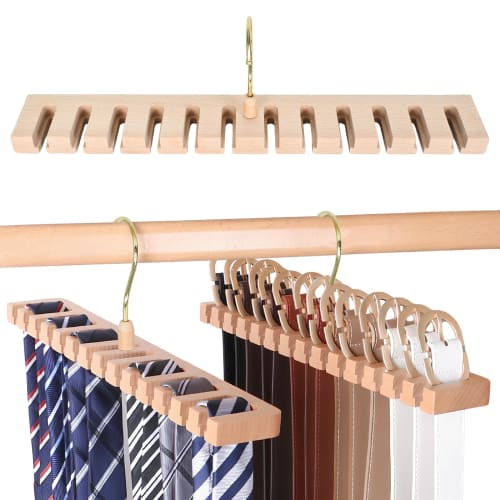 🔔Are you having trouble finding your belt or tie? 🔔Our belt and tie organizer will meet your needs.✅Our belt organizer is made of high quality solid wood, the surface is smooth, comfortable to touch, not easy to deform or break, and can be used for a long time.✅A wonderful birthday gift, anniversary gift, etc. for your husband, father, friend, family, partner, etc.Specifications: Color: Wood Color Size: 39*6cm/15.4*2.4inch Material: Wood Package Contents: Beech Wood Belt Hanger x 1 Features: ✔Premium Tie Hanger: Made of durable solid wood for long service life.This superior quality makes it perfect for organizing men's or women's belts.✔Large Capacity Belt Rack: Our belt hanger hook can hold up to 12 belts, preventing belts from getting cluttered, lost or damaged.A space saving solution for your closet.✔360° Swivel Hook: Swivel hook allows you to easily access the belt you need without having to sift through your entire collection.360° rotation feature allows you to easily view and select belts.✔Multi-purpose Closet Organizer: This closet belt hanger can not only hang belts, but also organize ties, scarves, hats, bags and towels in your closet.Two mounting options: Wall mounting: The belt holder can be fixed inside the door or wardrobe using the screw attachment.You can quickly get your favorite style on the go.Hanging Installation: You can use the hooks to attach this tie rack to your wardrobe.It doesn't take up much space and is easy to store.The hook rotates for easy access.