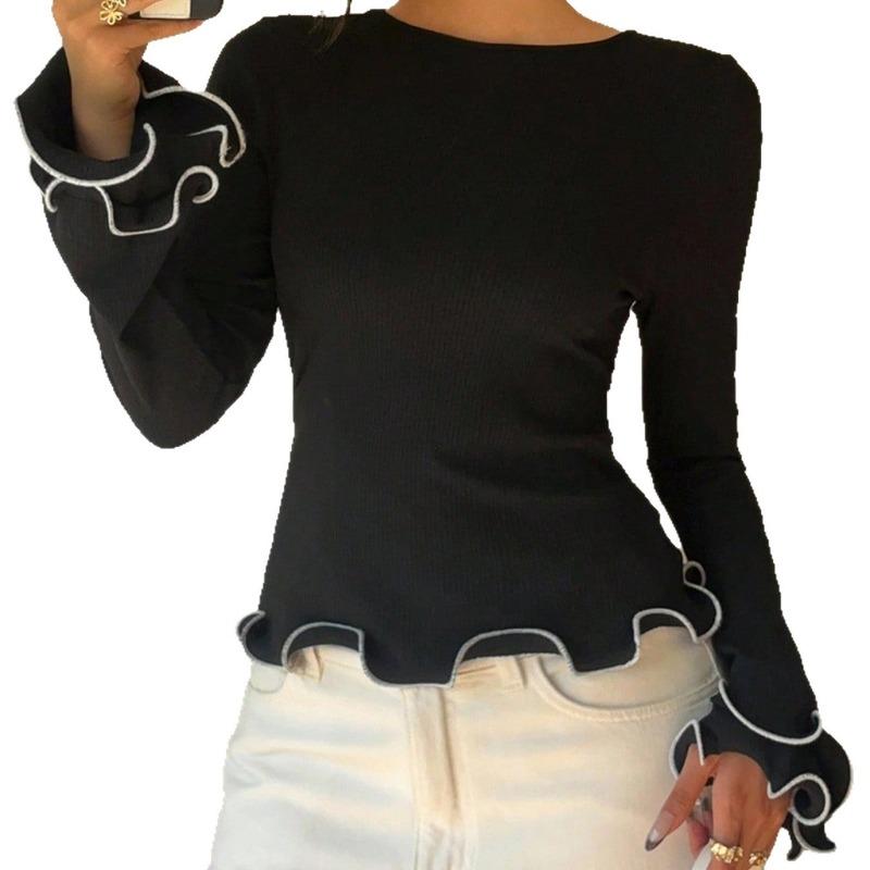Женская новая приталенная футболка с длинным рукавом, женский пуловер, базовая рубашка, свитер с контрастной отделкой «грибок»