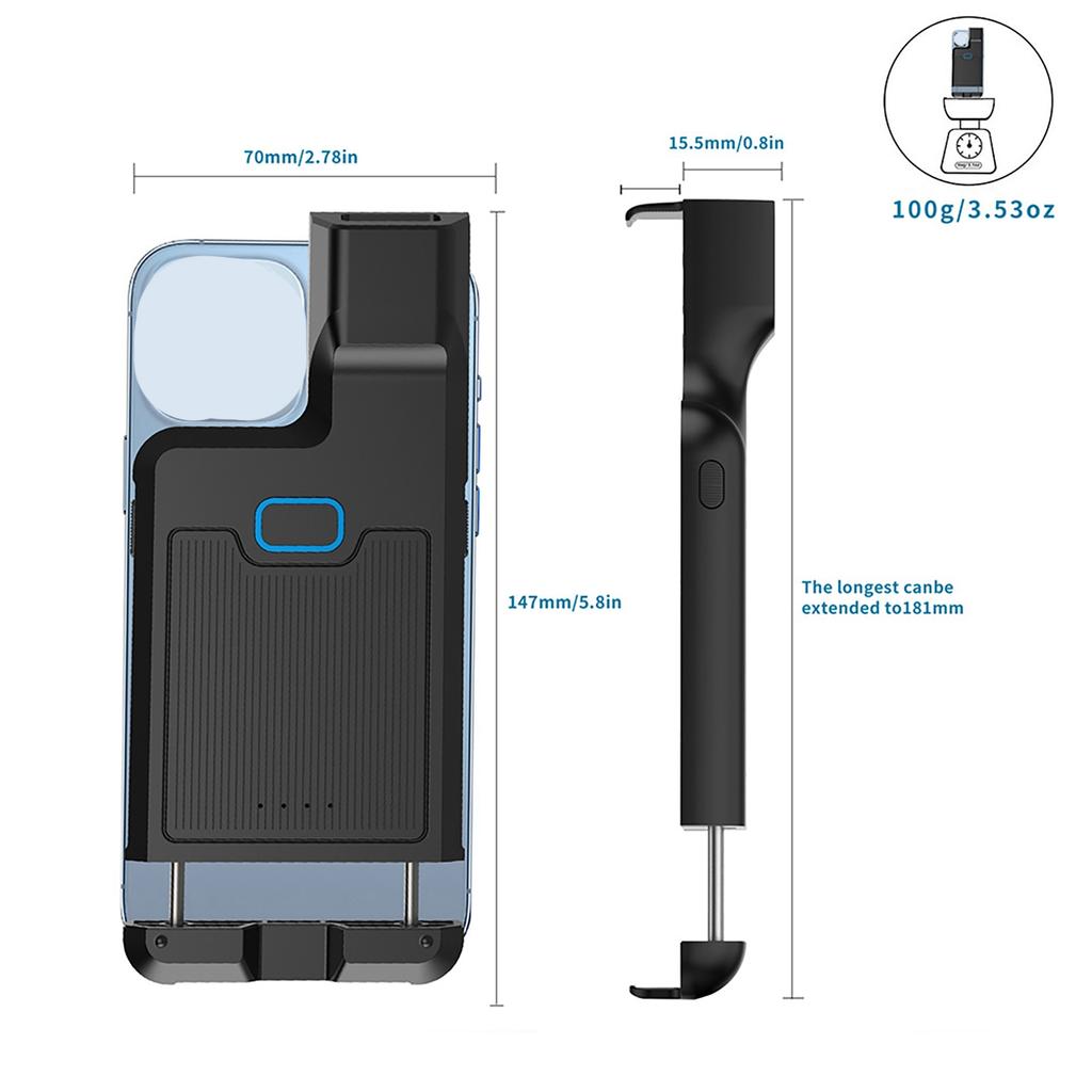 1. ▶ Barcode Scanner with Retractable Phone Back Clip Design:The well designed scanner does not block the mobile phone camera, and can be used as a mobile phone back clip. It is only 15.5mm thick and comfortable to hold. The bottom retractable bracket can clamp mobile phones with a length of 147 181mm(5.8 7.1in). It can also be used alone.