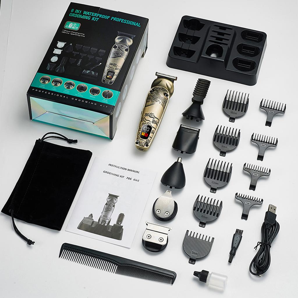 Full Metal Body Hairdresser 6 in 1 Multi Function Electric Push Clipper Nose Hair Clipper Set With 6 Blade Heads