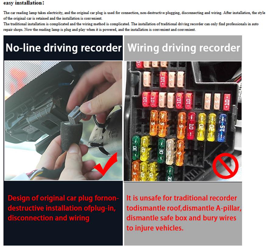 Традиционная установка сложна, и метод подключения сложен. Установка традиционного видеорегистратора возможна только у профессионалов в автомастерских.. Теперь лампа для чтения работает по принципу «подключи и работай» при подаче питания, а установка удобна и проста.