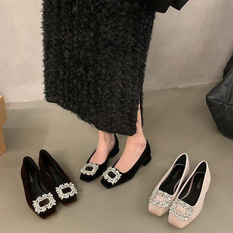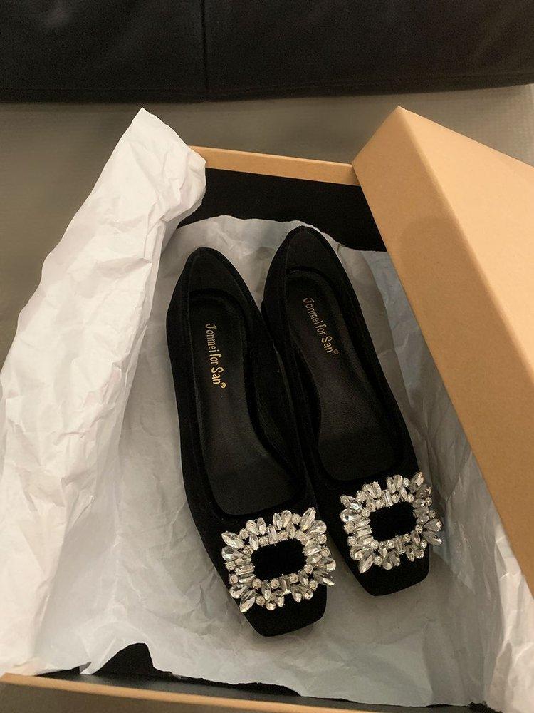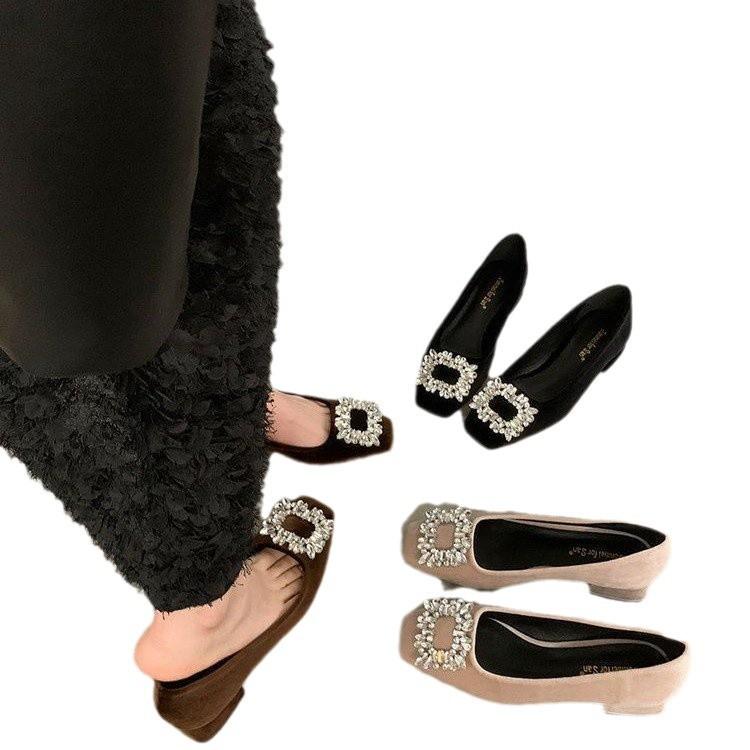 Премиальные туфли-лодочки с искусственными бриллиантами, женственный темперамент 2025, новая универсальная модель на плоской подошве с квадратным носком для весны и осени