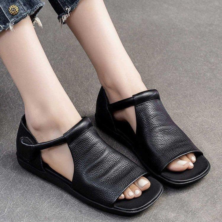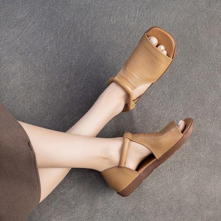 Модные сандалии с открытым носком на плоской подошве из мягкой натуральной кожи, женские, лето 2025, новая кожа, универсальные, повседневные, на липучке, с мыском «рыбий рот»