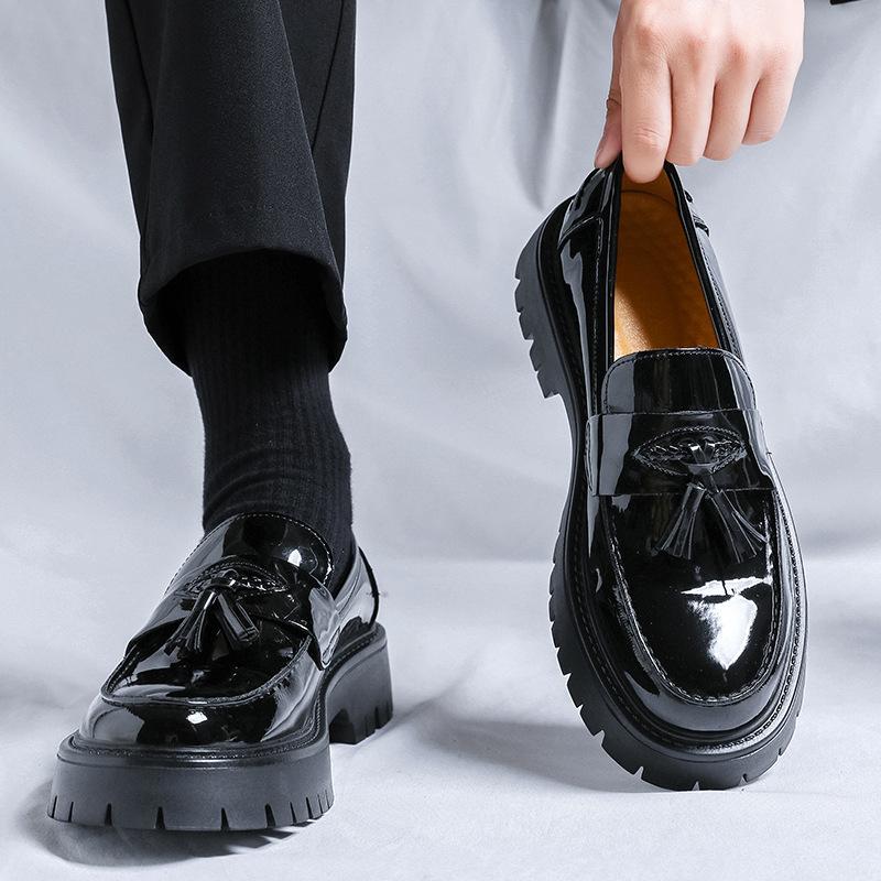 Мужская мода деловая свадебная обувь туфли слипоны с кисточками черные стильные лоферы на платформе дышащая обувь из лакированной кожи