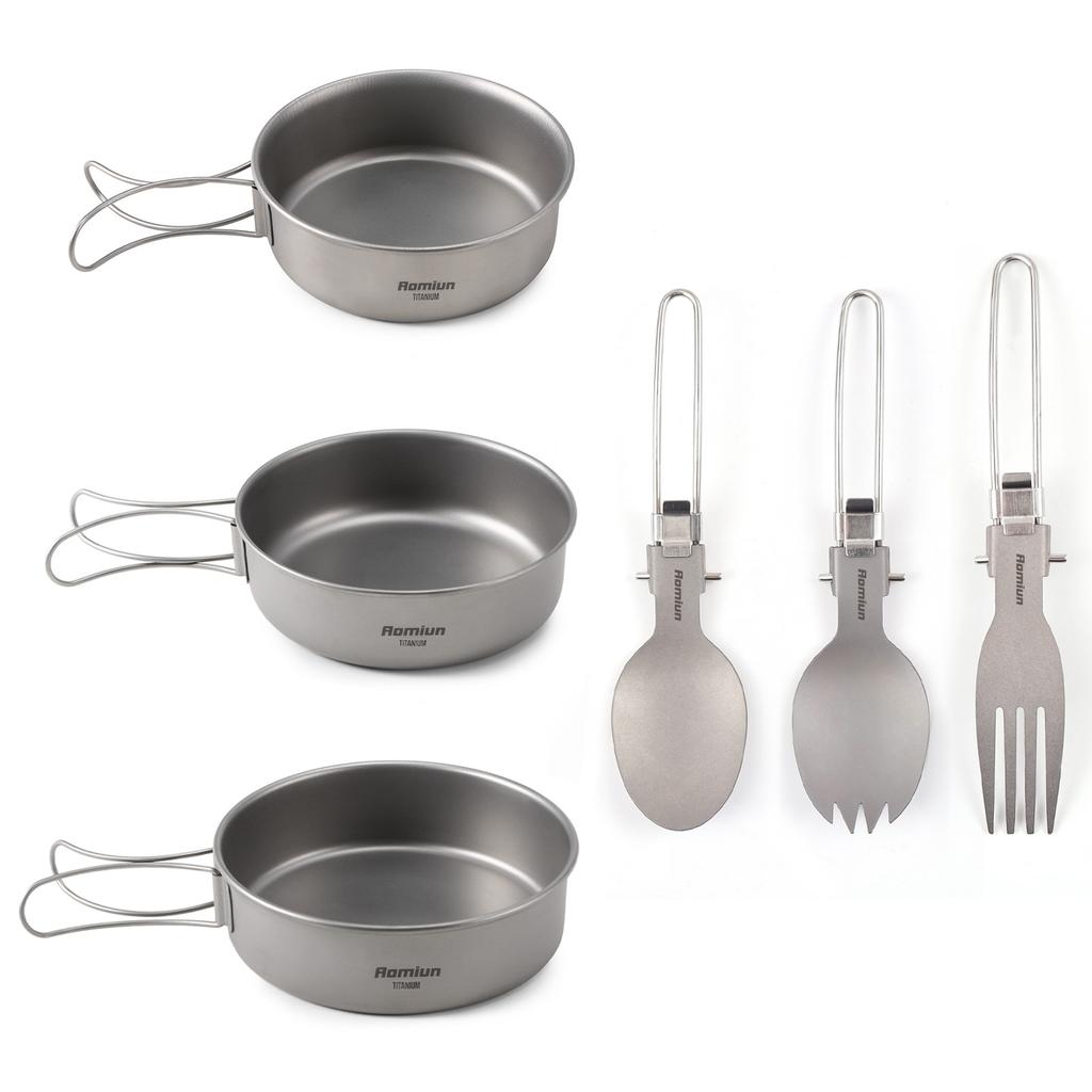 Camping Bowl and Utensil Set 3 Bowls Spoon Fork Combo Titanium Bowl with Folding Handle Ultralight Hiking Titanium