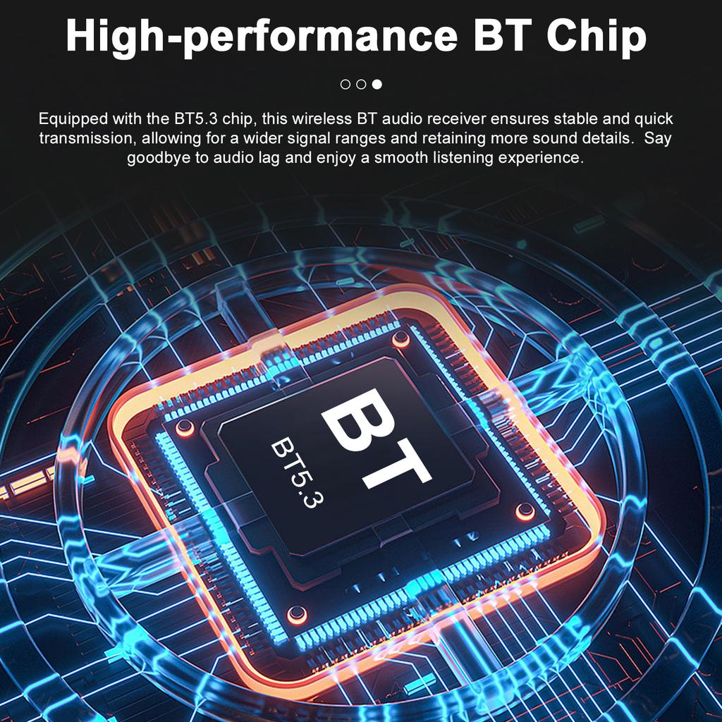 Высокопроизводительный чип BT: Оснащенный чипом BT5.3, этот беспроводной BT аудиоприемник обеспечивает стабильную и быструю передачу, позволяя расширить дальность сигнала и сохранить больше звуковых деталей.. Попрощайтесь с задержкой звука и наслаждайтесь плавным прослушиванием.