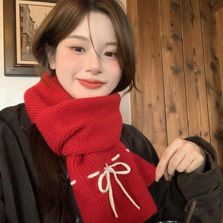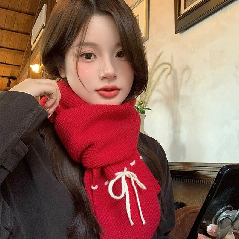 Шерстяной шарф с красным бантом в корейском стиле для женщин на осень и зиму, утолщенный, теплый, для защиты шеи, вязаный платок-шарф, зимний