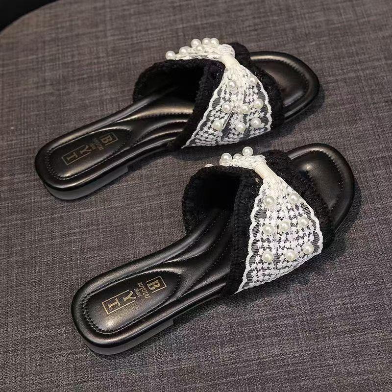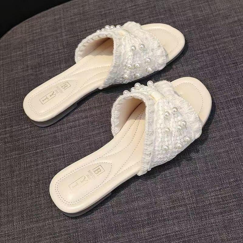 With skirt fairy style square head sandals 2025 summer new French pearl one-word drag women wear flat bottom explosion