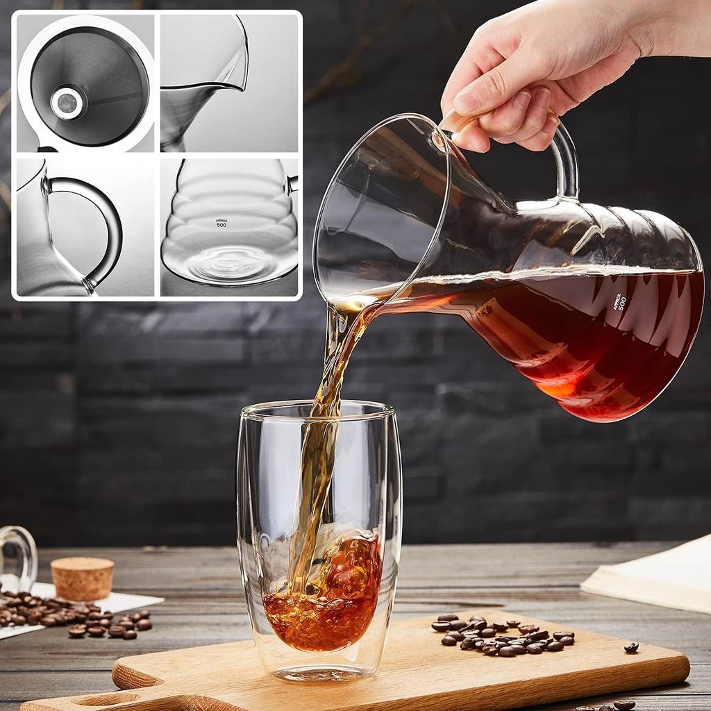 Pokaro Tea Coffee Server, Heat-Resistant Glass, 500ml, No Paper Coffee Filter Required, Stylish Drip Coffee Server, Reusable Stainless Steel Filter,