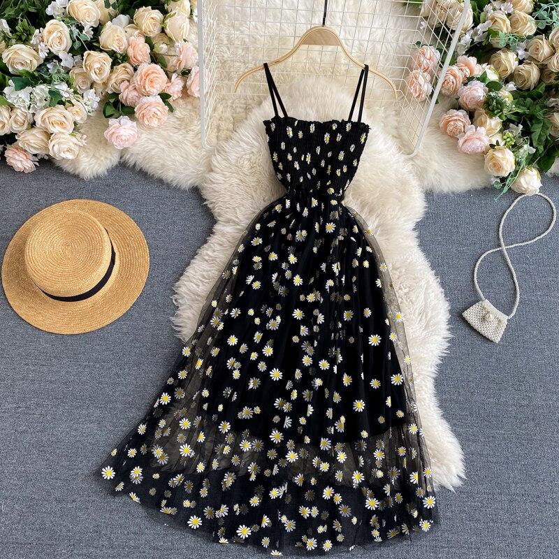 Весеннее и летнее сетчатое платье с высокой талией, маленькое платье с цветочным принтом на бретельках, французские тонкие женские платья в стиле ретро