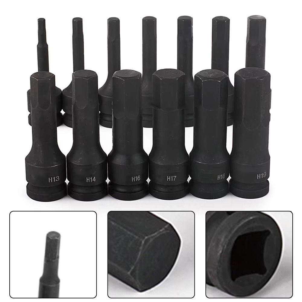 - 1/2 ''(12.5мм) квадратный интерфейс, шестиугольная головка, размеры: 4мм(0,16 дюйма), 5мм(0,20 дюйма), 6мм(0.24 дюйма), 7мм(0.28 дюйма), 8мм(0,31 дюйма), 9мм(0.35 дюйма), 10мм(0,39 дюйма), 11мм(0.43 дюйма), 12мм(0,47 дюйма), 13мм(0,51 дюйма), 14мм(0.55 дюймов), 16мм(0,63 дюйма), 17мм(0.67 дюйма), 18мм(0.71 дюйма), 19мм(0.75в). Общая длина 80 мм.(3.15 дюйма).